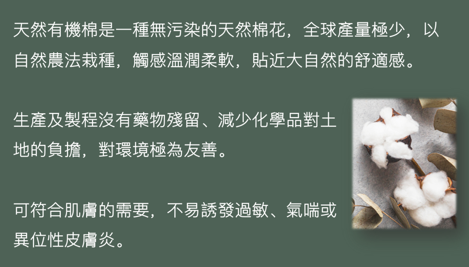 採用有機認證棉花田栽種收成之棉花製成床面布料